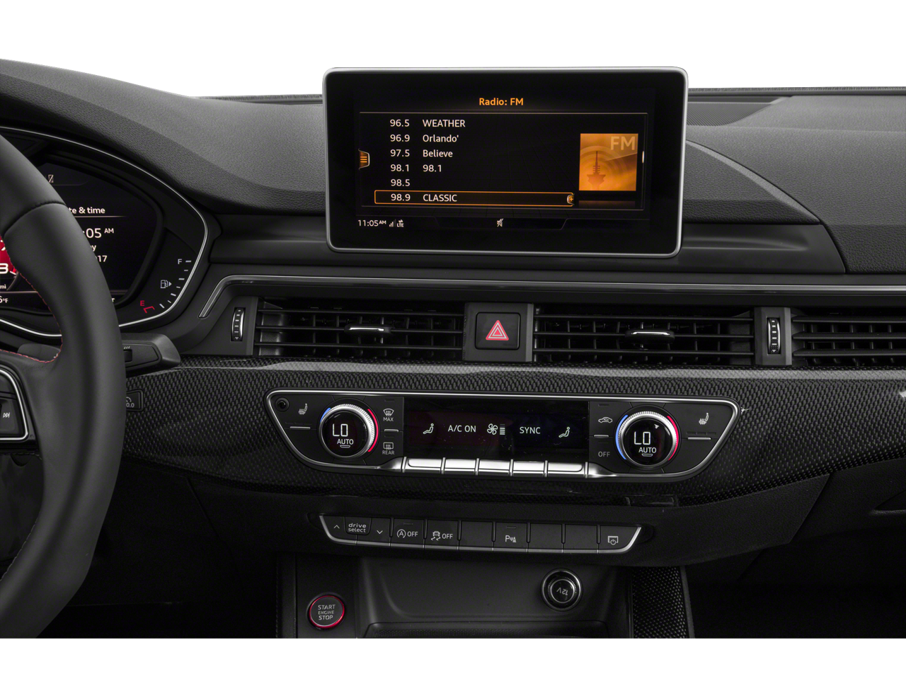 - Radio: Sistema de sonido Audi, que incluye: 10 altavoces, amplificador de 6 canales, 180 vatios, interfaz de música USB Audi, interfaz para smartphone Audi (Android Auto y Apple CarPlay), preparación Bluetooth® para teléfono móvil y tecnología HD Radio.