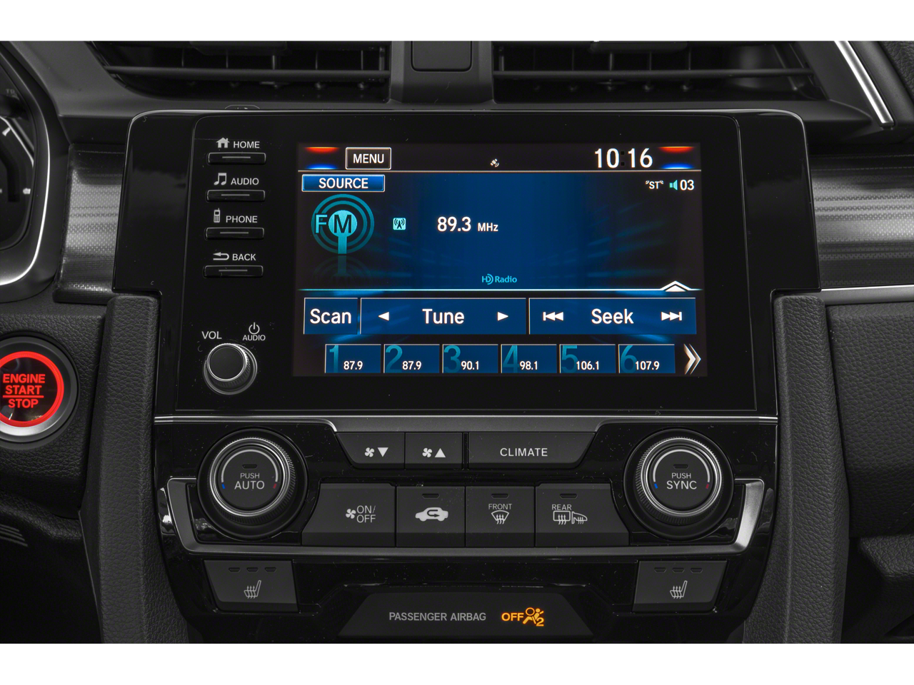 - Radio: Sistema de audio AM/FM/HD/SiriusXM de 180 vatios, que incluye: 8 altavoces, pantalla de 7 pulgadas con pantalla táctil electrostática de alta resolución, mando y teclas físicas para los controles principales y ajustes personalizables, Bluetooth® HandsFreeLink, transmisión de audio por Bluetooth®, sistema de datos de radio (RDS), compensación de volumen sensible a la velocidad (SVC), interfaz USB para smartphone/audio de 1,5 amperios en la parte delantera, puerto de interfaz de audio USB de 1,0 amperios en la consola central, HondaLink, integración con Apple CarPlay, integración con Android Auto, función de mensajes de texto SMS, antena tipo aleta montada en el techo y controles iluminados en el volante.