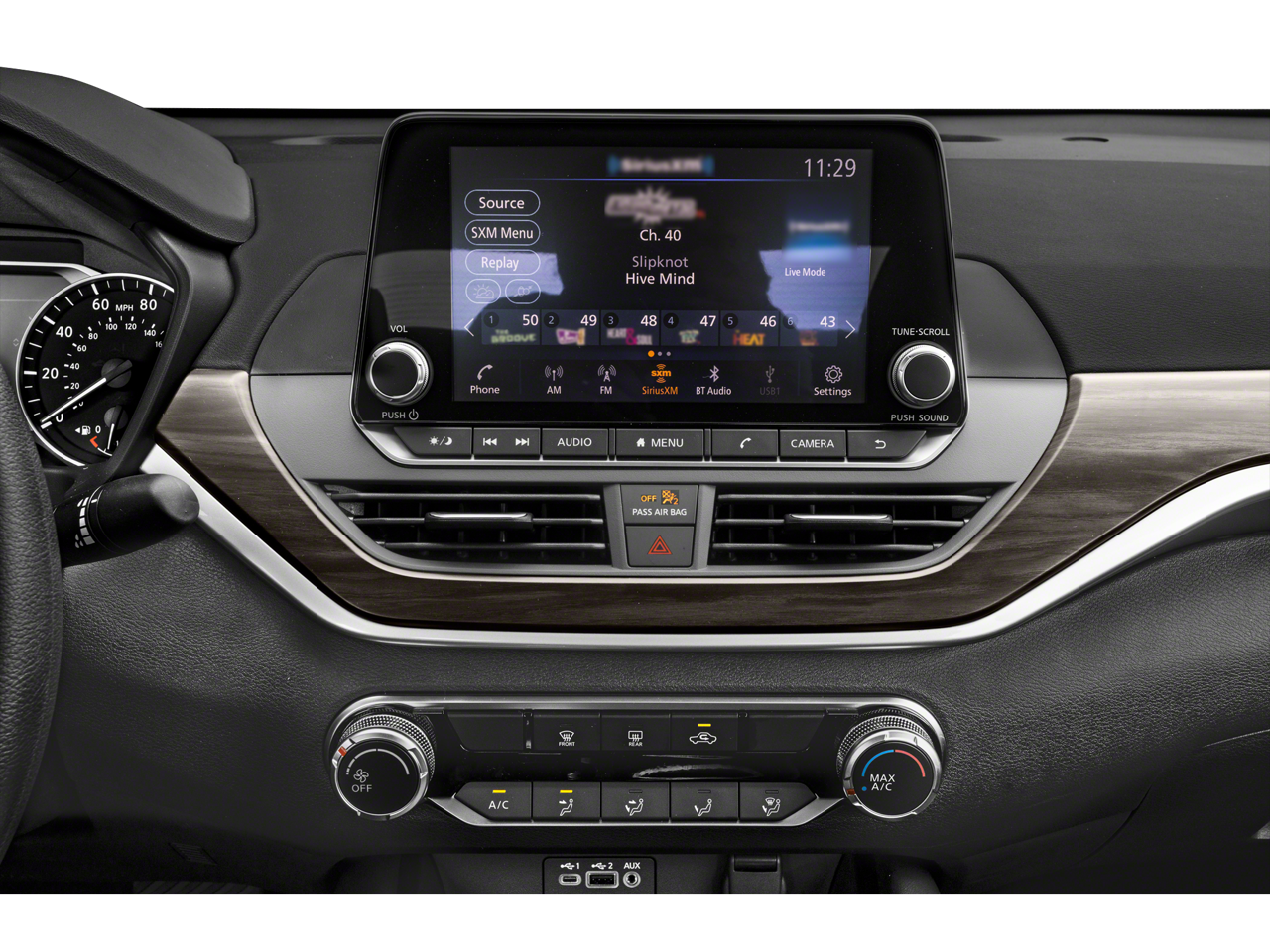- Radio: Sistema de audio AM/FM -inc: RDS, MP3 y entrada auxiliar, 6 altavoces, NissanConnect con Apple CarPlay, Android Auto, pantalla a color de 8" con control multitáctil, 1 puerto USB frontal iluminado (tipo C) para dispositivos compatibles, radio SiriusXM, sistema de teléfono manos libres Bluetooth®, transmisión de audio a través de Bluetooth®, asistente de mensajes de texto manos libres, reconocimiento de voz Siri Eyes Free y Google Assistant.